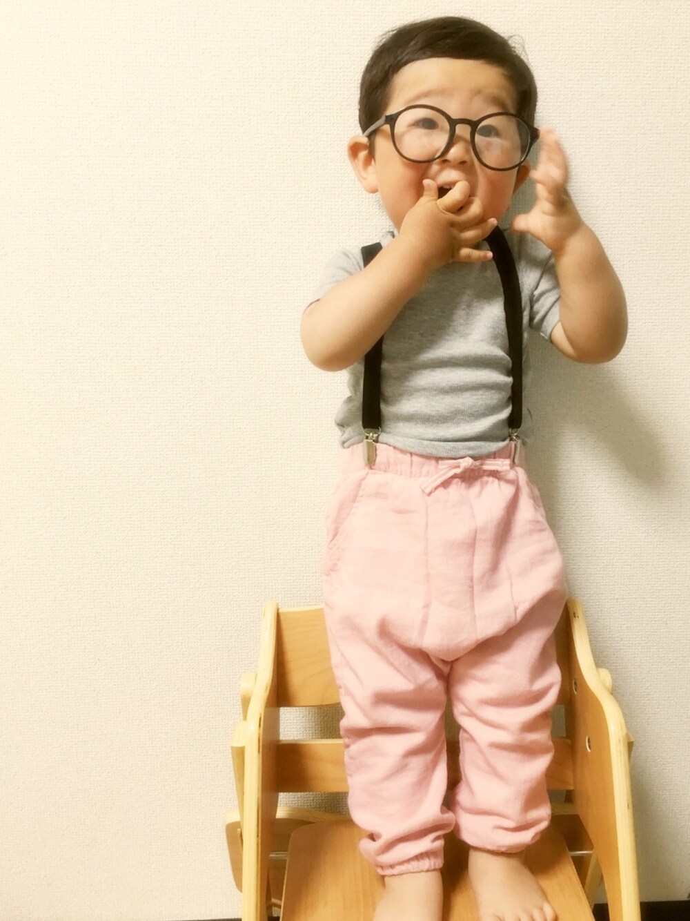 シンプルコーデ🙆🙆 本日もpetit mainさんでドラフト参加させて頂いてます(^^) シンプルなグレーのトップスにはピンクのパンツとサスペンダーで👕👖 今日また食いだおれさんに似てるな😂😂
