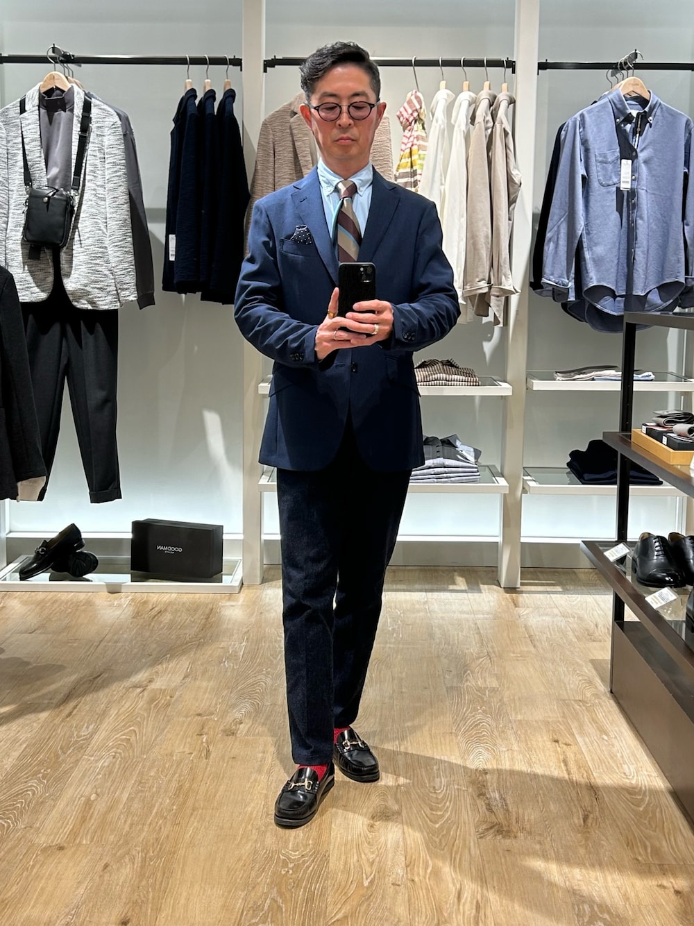 明るめなネイビーカラーのジャケットにインディゴデニムをチョイス! インナーは爽やかなブルーBDシャツにベージュ×ブラウン×ブルーのネクタイをコーディネート! かしこまり過ぎない大人カジュアル!