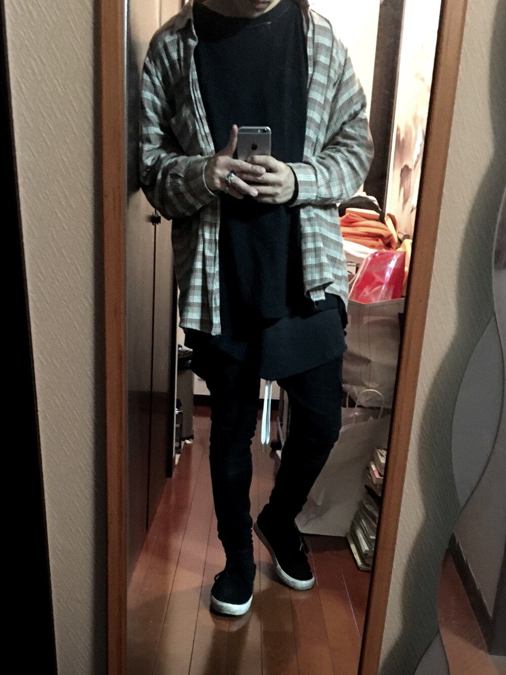 ブラック系のスニーカー、ブラック系のその他パンツ、ブラック系のTシャツ/カットソーを着用したメンズの秋コーディネートの1枚目の写真