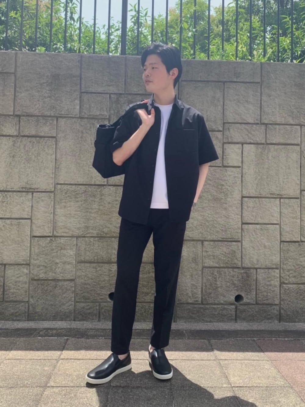 身長:177cm 着用サイズ:シャツ、インナー、ボトムスL/シューズ27.5cm 【サイズ感】 シャツ:身幅ややゆったり ボトムス:ウエストややゆったり シューズ:やや大きめ。(気にはならない程度) モノトーンで合わせたセットアップコーデです。インナーや、シューズもシンプルにまとめているので、普段着はもちろん、夏の私服通勤着としてもおすすめです。