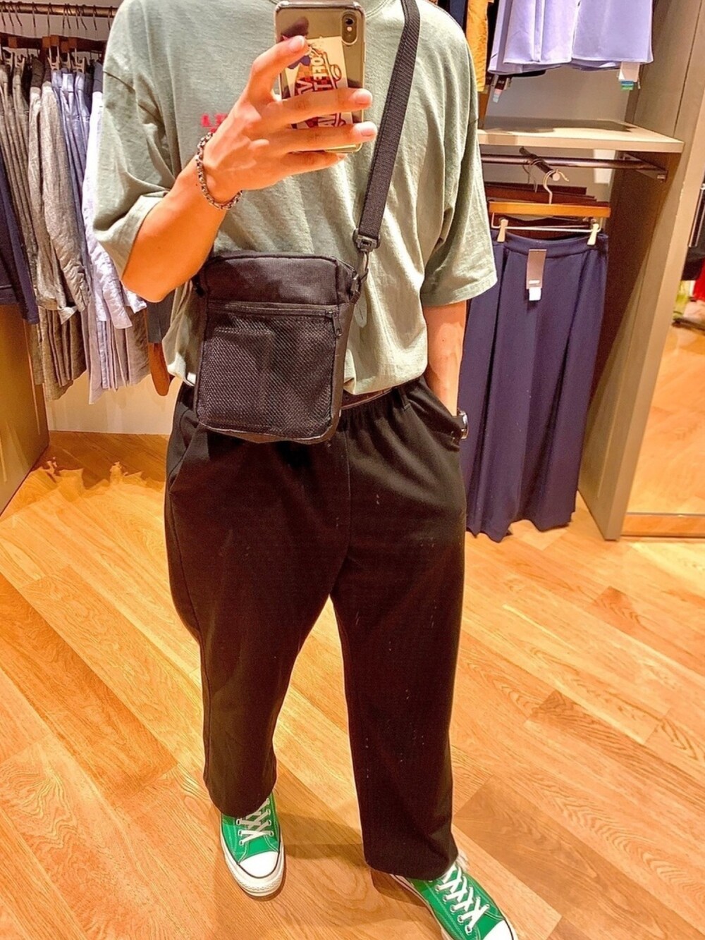 御殿場のアウトレット行って爆買いしました!! そしてついにctの緑を手に入れました🟩 可愛すぎてずっと履いてます笑 TシャツもFREAK'S STOREで買った緑Tです。緑キてます👍