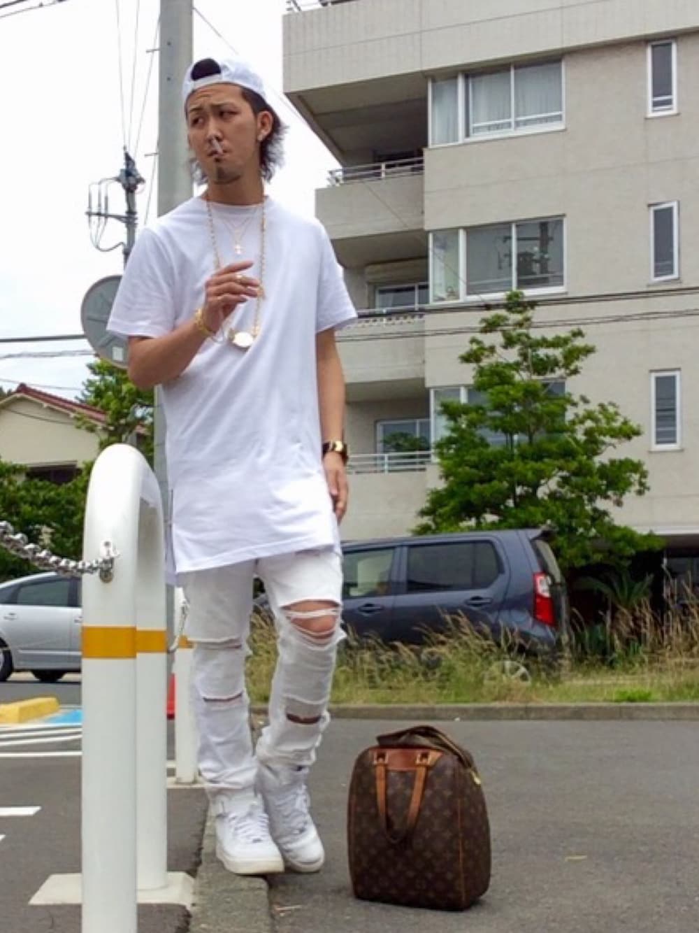 OOTD... WHITE STYLE!!! 本日わVERSACEのネックレス、LVのバック、AF1と久々な物達たくさん! ちなみに小物以外わUNIQLOとH&Mです。笑