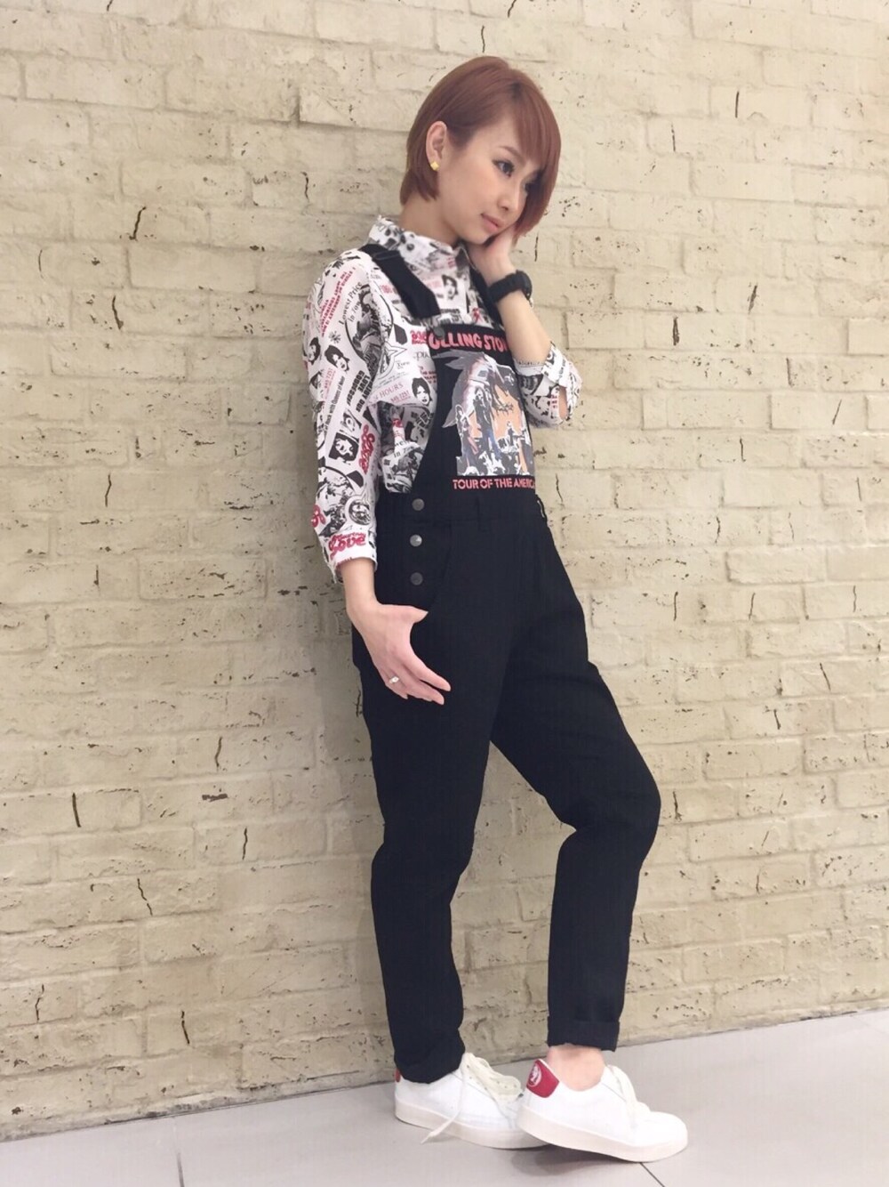 The Rolling Stonesのプリントがはいったサルエルシルエットのオーバーオールにあえての柄シャツを合わせてfunkyに✨ かなりインパクトのあるコーデに☺