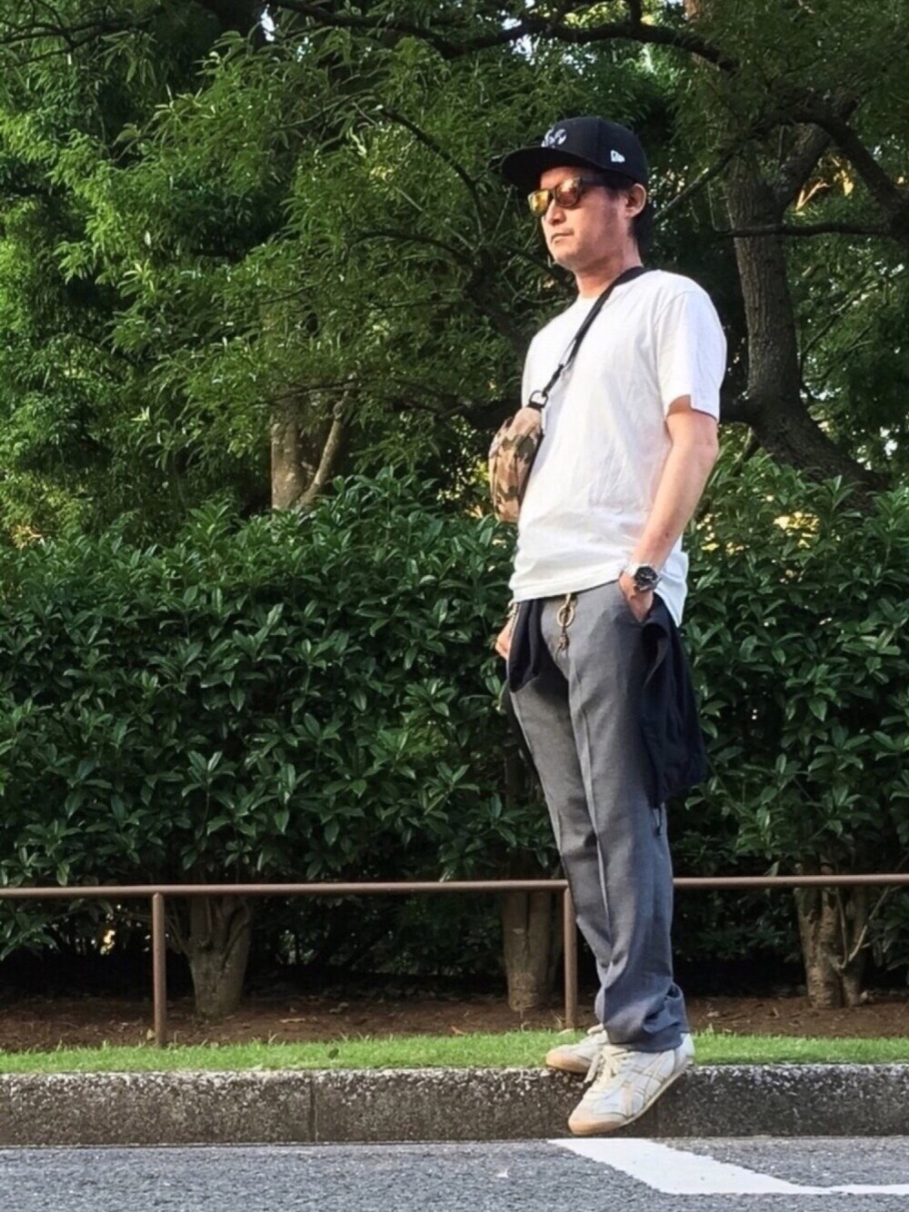 白Tシャツ×白スニーカー👟 💫 デニムの代わりにパンツスタイル ✨ シンプルコーデに、少し大きめのダイバーズウォッチで腕元にポイントを 🌟
