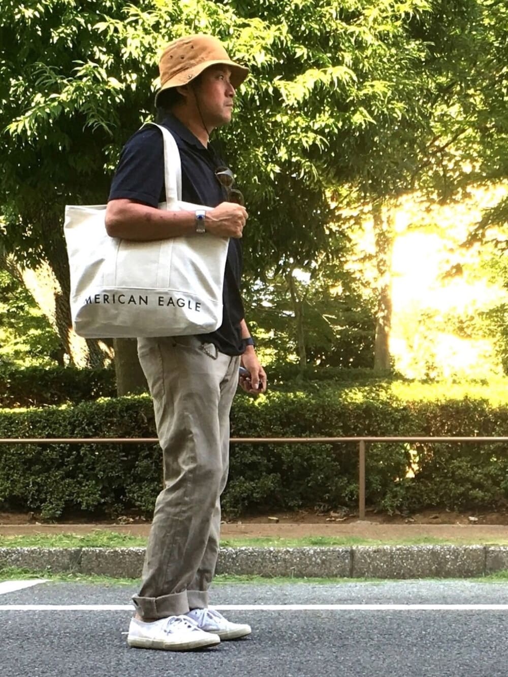 ♯コーデが引き締まる黒シャツ ♯使い勝手抜群のAEOのロゴトート ♯ベージュと黒の最強コンビネーション