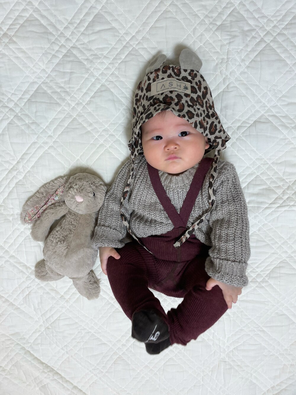 #タックイン ? #冬コーデ かなーり久々にH&Mでお買い物 ✌️😊 チャンキーニットの白が欲しくて…色々さがしてみたけれど…これだっ!思ったやつはサイズが完売していたりでなかなか出会えず🙈🌀 そんな時にこのグレージュをみつけたので👀✨プチプラだし、白じゃなかったけど😁買ってみました♡ どうもやっぱり?!このコーデじゃ男の子っぽくなっちゃったけど😂👍可愛い🐰♡ いろんな色集めちゃってるSillySilasは、新色のボルドーぽいカラーFigのレギンスをget😊♡ ASH generationのハットは迷いに迷って〜くまみみのレオパード柄にしてみました🐆♡ 昔から帽子が好きで😍つい買っちゃうんだけど…順調に👶🏻の被り物も増えていってます😂♡ ✒︎HIRARA 気付けば8mになりました🤗はやいー‼︎ でもこれは→7m20d 📸💕