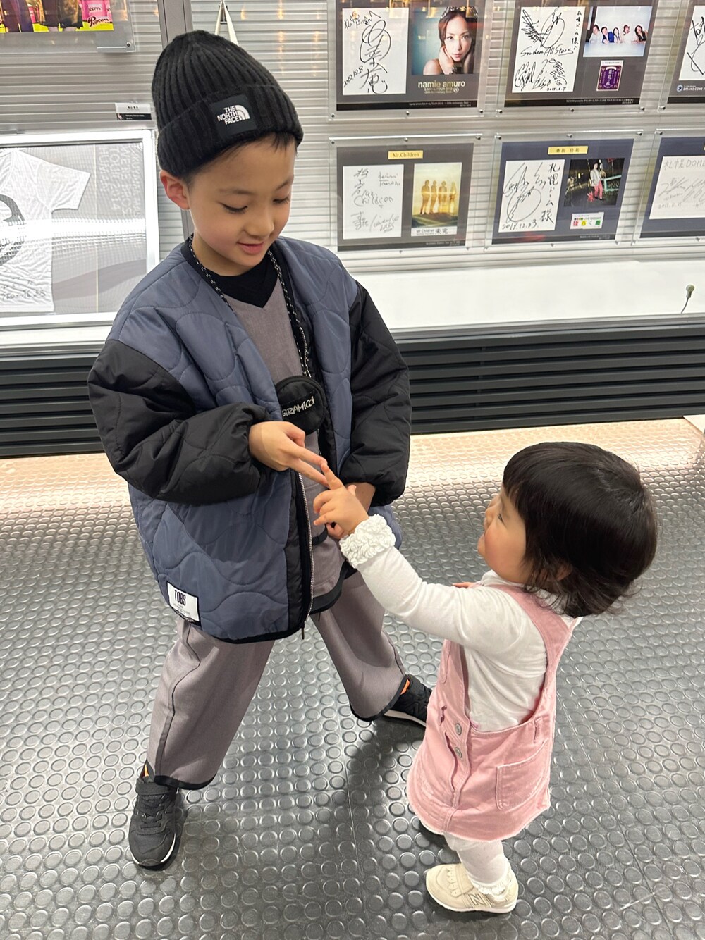 またまた春休み中のコーデですが… アンパンマンミュージカルを観て✨サッカー観戦⚽️した日 👦🏻💗👧🏻 兄は👦🏻おとばなさんのセットアップ×キルティングジャケットでまるまるおとばなさんコーデでした🌹 ネオンオレンジのちらりん🧦を差し色に〜🧡 妹は👧🏻GAPのパステルピンクのジャンバースカート×袖フリルが可愛いMud pieのロンTをあわせてました💗 2枚目以降のZARAの花柄ジャケットは👧🏻の最近のお気に入り💙登園もこのアウターです💙 まだまだアンパンマンが大好きな👧🏻は、アンパンマンに大大大興奮でした🌈 なので、その後のサッカー観戦は⚽️大歓声にも動じる事なく😂爆睡でした💤 大物感😪💤 SHOKI 7y5m HIRARA 2y