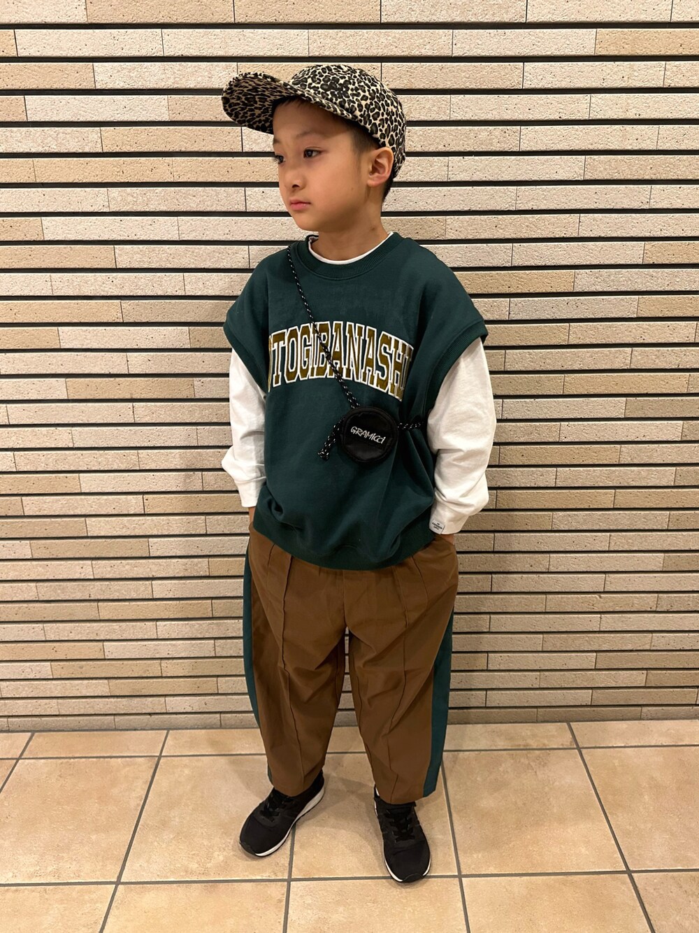 ベスト × ロンT にラインパンツをあわせました💚🤍🤎 まるっとおとばなさんコーデでした🌹 🐆秋になるとレオパ熱が上がります😂 そんなこんなで、最近このレオパキャップ🧢をかぶる機会が増えております🍁 🐆8y 💚🤍🤎 132cm / 23kg
