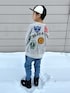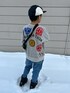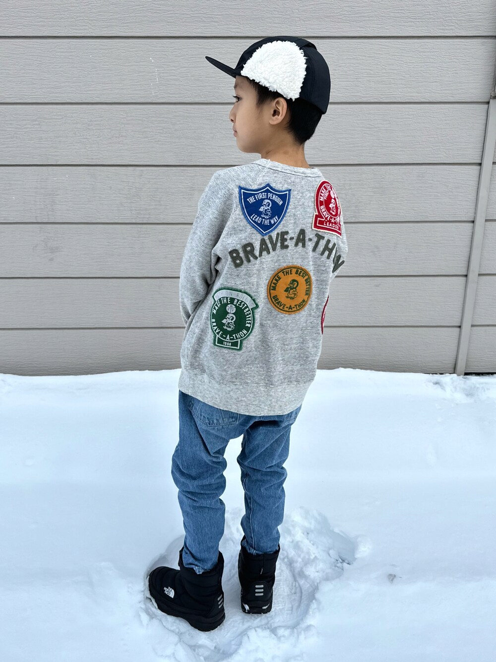 #デニム 前コーデのなかみ 🐧❤️💙💚 背中のワッペンが可愛いDDのペンギンスウェットが✨new ☃️ 別注デザインのやつなんだけど▷👦🏻も気に入っていたので、沢山着てもらおうと思います🤗♬ GROOVYのデニムも形が可愛くてお気に入り〜🩵 🐧8y1m ❤️💙💚 133cm / 26.4kg