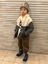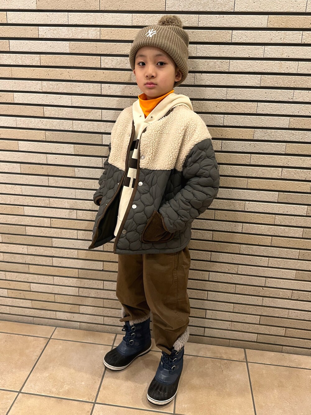 #キルティング キルティングジャケットに 🍊タートル × パーカーをレイヤード🧡🤍💚🤎 ノーカラーにはパーカーをあわせたくなります😉 オレンジを差し色に〜🍊 今日から新学期がスタートしました 🏫 上靴👟… 忘れて行きました…🙄 🧡 8y2m 🤍💚🤎 133cm / 26.4kg