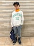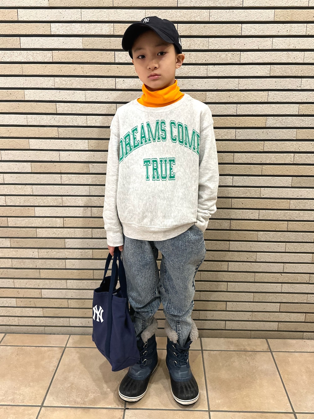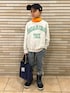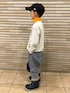 スウェット × タートル 🧡🩶💚 最近寒いので ❄︎ タートルレイヤードをしがちです🙂 DDのリバーシブルスウェットは表裏どちらも可愛いくてお気に入りのやつ🫶 裏側で着ています😋💚 ガーデナーテーパードデニムにあわせてみました👖♬ 暴風雪警報で明日学校が休校になり😮びっくり… 🧡8y2m 🩶💚 133cm / 26.4kg