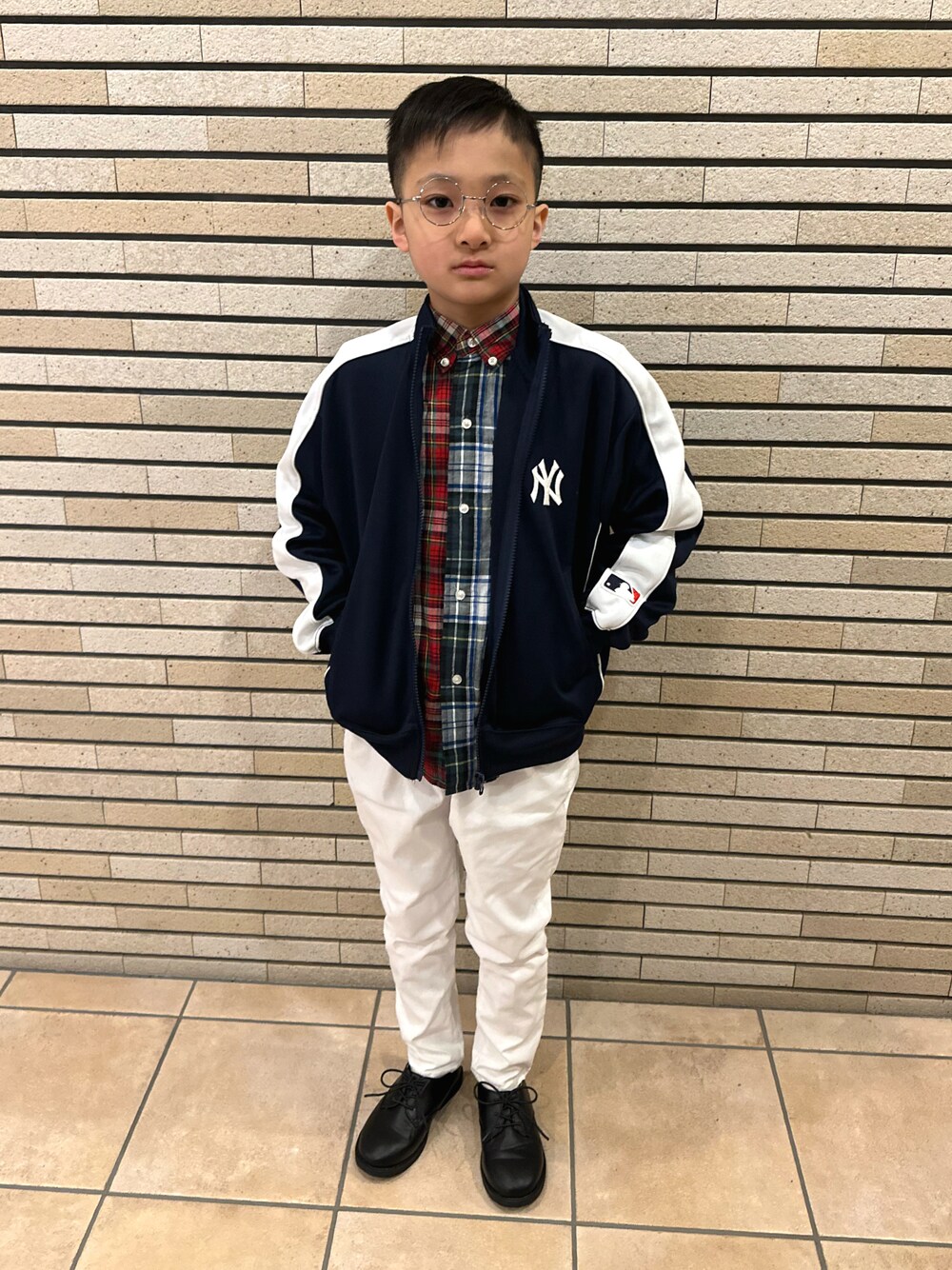トラックジャケット着回しコーデ 🫶 チェックシャツ × 白パンツ × ドレスシューズ 白パンツにドレスシューズをあわせて… ジャージをちょっと綺麗目に✨ 8y5m 💙❤️🤍 133cm / 27kg