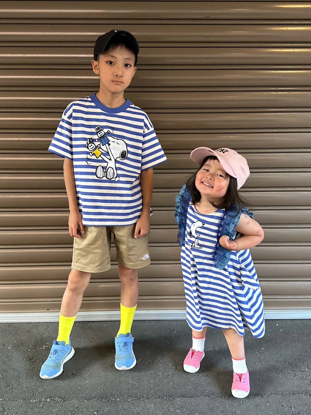 MARKEY'Sのスヌーピーシリーズで💛👦🏻👧🏻🩷リンク💙🤍 それぞれどのタイプにしてあわせるか🤔買う時に…まよいにまよった結果 ▷ 同色ボーダーのTシャツ&ワンピースにしてみました😋💙🤍 おそろいを嫌がらないうちに沢山着てもらいたいと思います🤭‼︎ 👦🏻 ▷ 今年買ったノースのハーフパンツ+バクプリにあわせたイエロー🧦がポイント🟡 👧🏻 ▷ キャップ&ソックス&シューズはピンクであわせました🩷どれも譲らぬ本人の希望でした😊🫶 ワンピこんなデザインだったかな😳!?思いきや、ポケットを出していた事が判明😂 キャップも🧢🧢NEW ERAのヤンキースであわせたよ😘 ふたりの後ろ姿もとっても好きな感じでした😍‼︎ そして、このコーデでユニバ行きた〜い🤩思ったのでした💘 👦🏻 8y6m 💙🤍💛 134.2cm / 26kg 👧🏻 3y3m 💙🤍🩷 96cm / 16kg