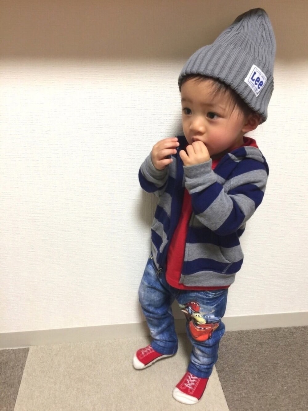 今日の息子氏 朝から自分の閉めた扉に小指をはさんで血豆になり、物を倒してその上に立ち転んでおでこにたんこぶ😟そんなことばっかりやってるし、お茶をわざと口から垂らしながら歩き回るからまーーーもーーー💢怒ってばかりいたら😡💢繊細な方のわんこ🐶が隅でぶるぶる震えてなかなか寄ってこなくなってしまった😭笑 そんなに怖かったのだろうか😭でも当の本人は真剣に言っても笑うばかりで怒られているなんて全く思っていやしない😫やれやれ🙄 StompStampのデニムのように見えて実はデニムではないリアルなデニム転写プリントのパンツ💗綿100%だしカーズだしお気に入り😍💕デニムにしか見えなーい🚗