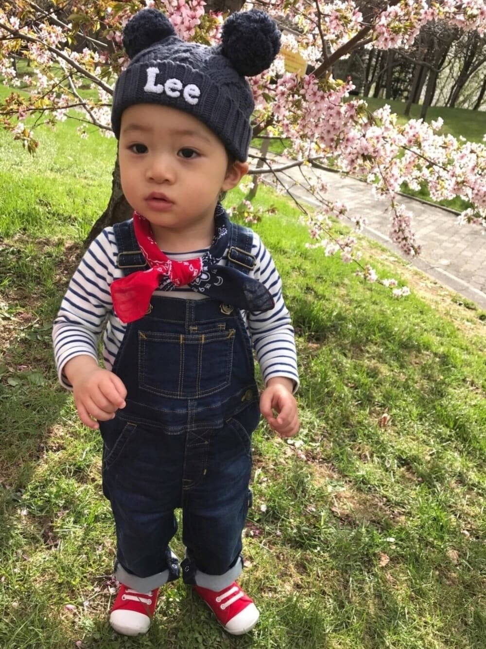 先日🤗微妙〜な写真しか撮れなかったのだけども🌸桜🌸を見に行きました😀♪散りはじめの🌸笑 満開は見逃したけど、なかなか綺麗でした♪ そんな日のコーデ😜 DAISOのバンダナ🎀赤とネイビー半分ずつになってて可愛いーこと😍可愛いーこと💘¥100バンザイ🙌