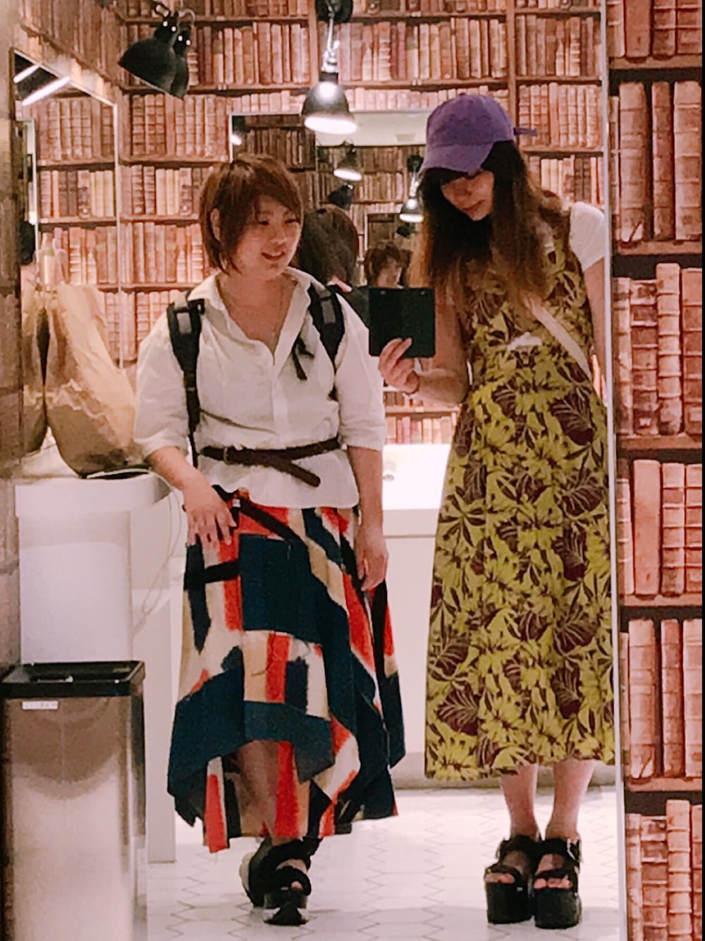 リンクコーデ 柄スカート 白トップス 厚底 東京巡り ショッピング