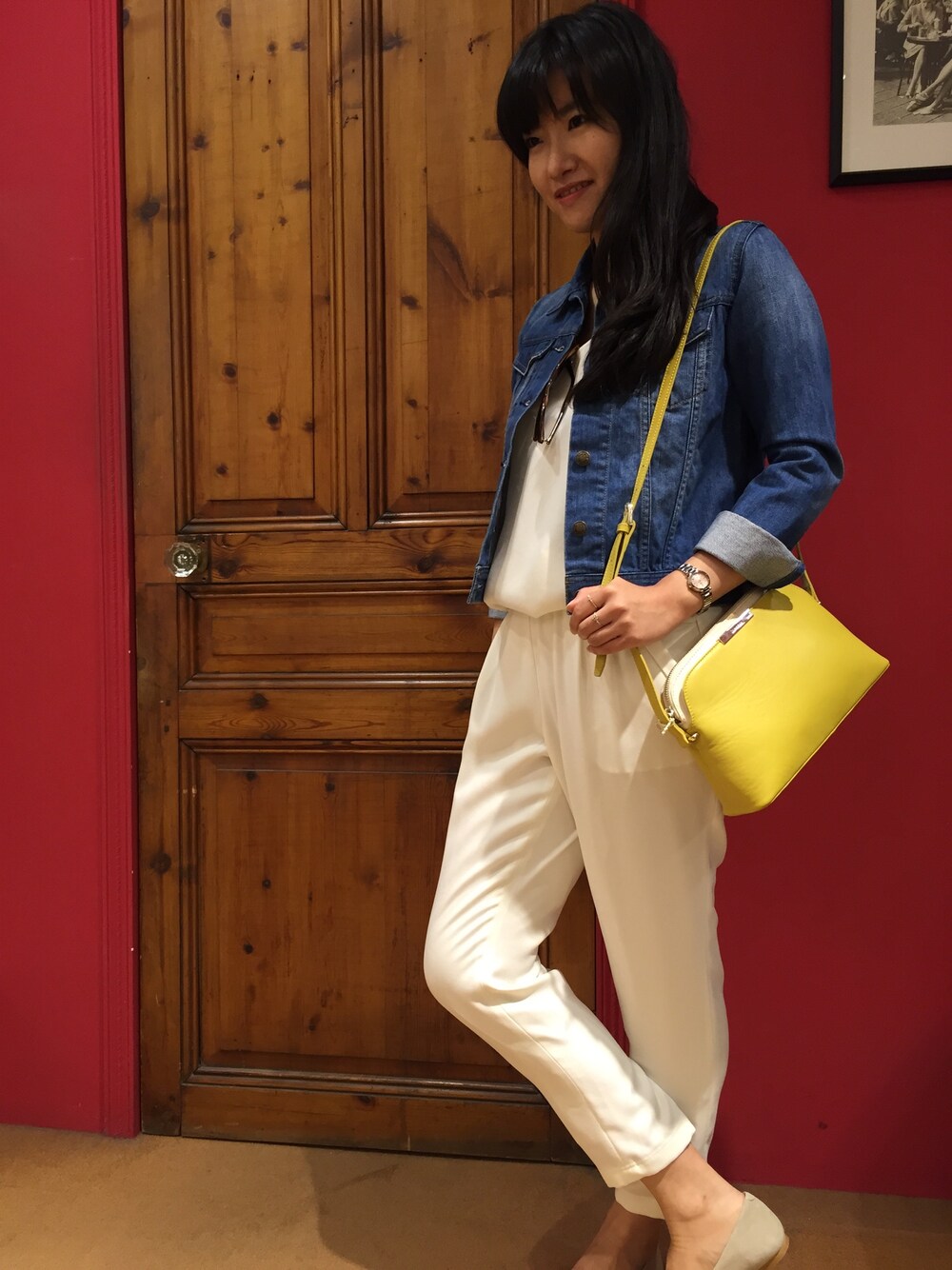 Gジャン合わせで、フリルスリーブセットアップがカジュアルに変身。イエローのショルダーバッグをアクセントにして春っぽく。