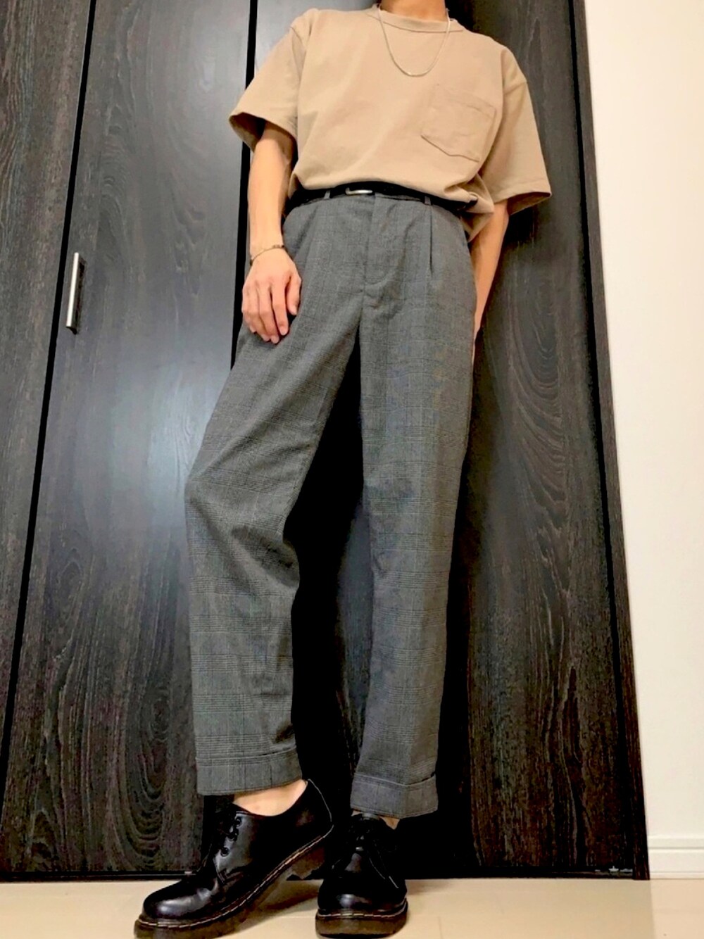 秋コーデ🍁🍂 いつもいいね、お気に入りありがとうございます!! いいなと思ったらフォローして頂けると幸いです😔 GUのポンチクルーネックTシャツのベージュとグレーのチェックパンツを使ったコーデです✨