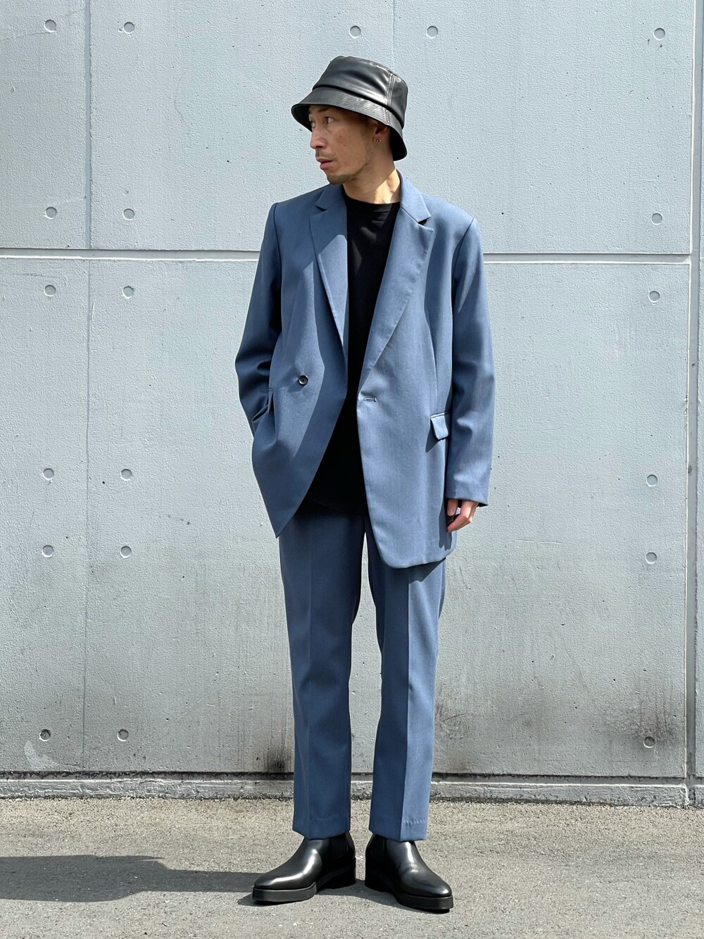 ブルーセットアップ。 セミダブルで着丈も長く、クラシックな印象のjacket。 pantsはスリムストレートでスッキリとみせました。