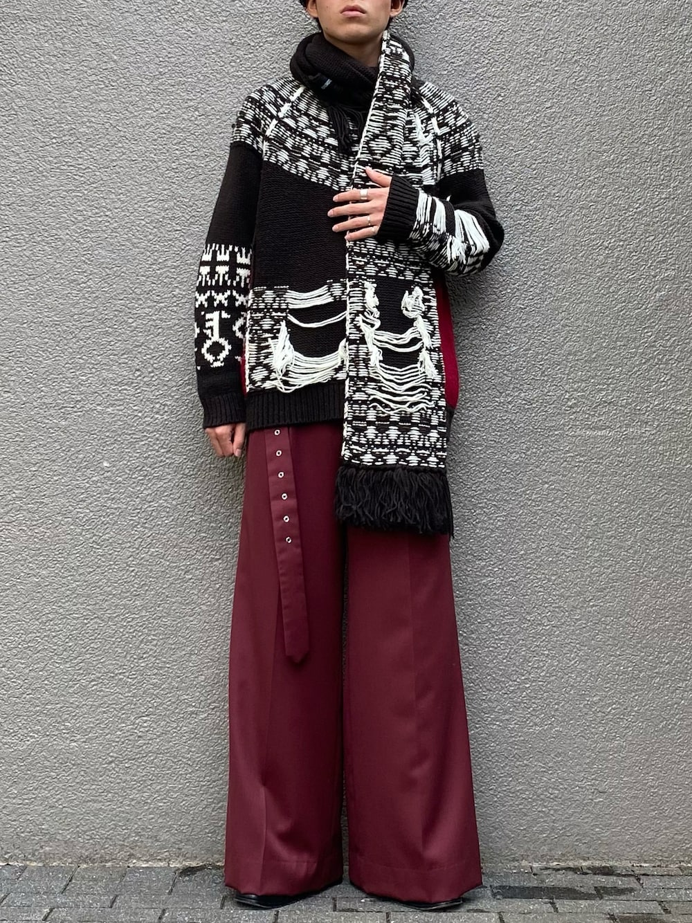 こんにちは!いつも閲覧ありがとうございます! 今日は個性的な柄のニットとマフラーを使ったコーデです! 右袖以外がインサイドアウトのデザインになっており、面白いですよね! パンツはワイドフレアの形のフルレングスパンツ。やっぱり好きですねこの形😊 マキシ丈のパンツにはブーツを合わせたいですね😊