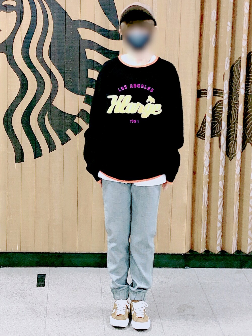🔸トップスはXLARGE。 ブラック地に刺繍のオレンジ色とパープル色がネオンのようにキラキラ✨しています。可愛いです♡ 🔸パンツは、x-girl 。 ホワイト×ネイビーブラックのタータンチェック。糸が蛍光黄緑で細かいところまで凝ったデザインです。 🔸シューズはヒステリックグラマー。 🔸キャップはXLARGE。 全体のトーンを柔らかくする、淡い茶系をチョイスしました。 スウェットをメインに、ストリート系綺麗目を意識しました✨