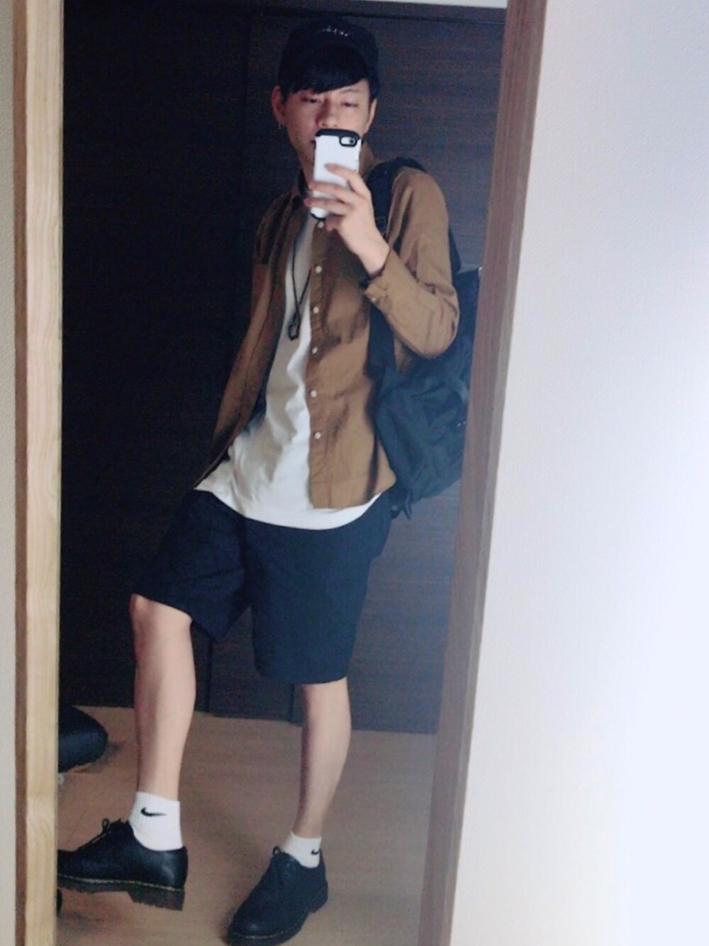 無印のシャツの色お気に入りです🎇 白、黒、茶コーデ 初投稿してみました👕