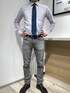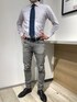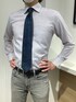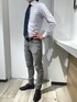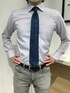 パープルのシャツに定番のネイビーのネクタイを合わせました。
