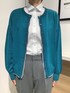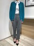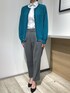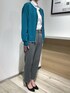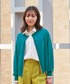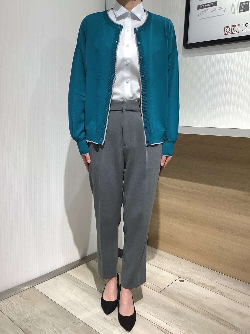 マイターデザインがポイントのブルーシャツに、鮮やかなグリーンのカーディガンを合わせたオフィスカジュアルスタイル。