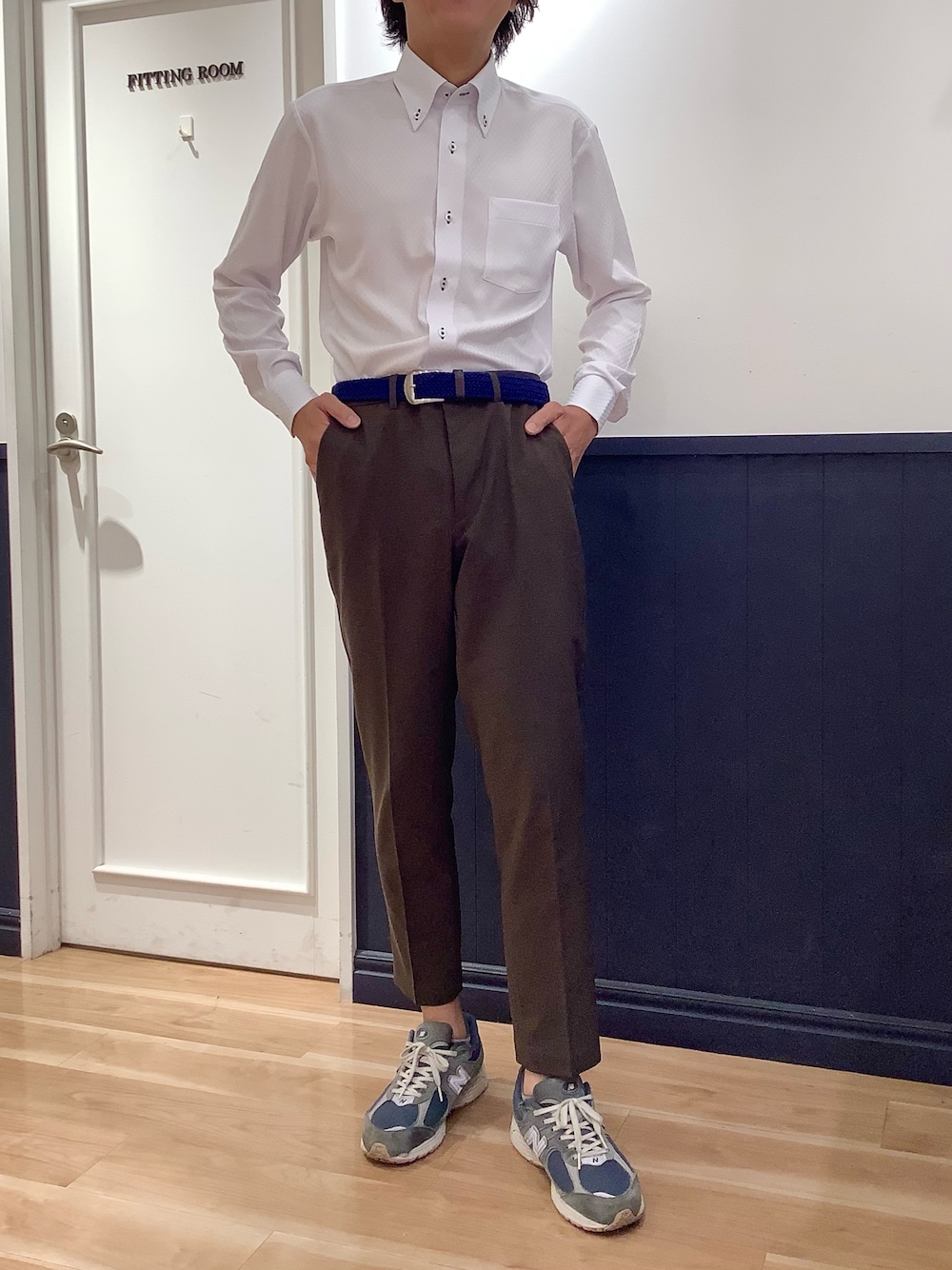カジュアルさときちんと感のバランスを意識したビジカジスタイルです。 シンプルな白シャツが上品さを演出してくれます。 ブルーのベルトとスニーカーで程よく個性を出しました。