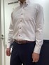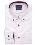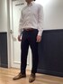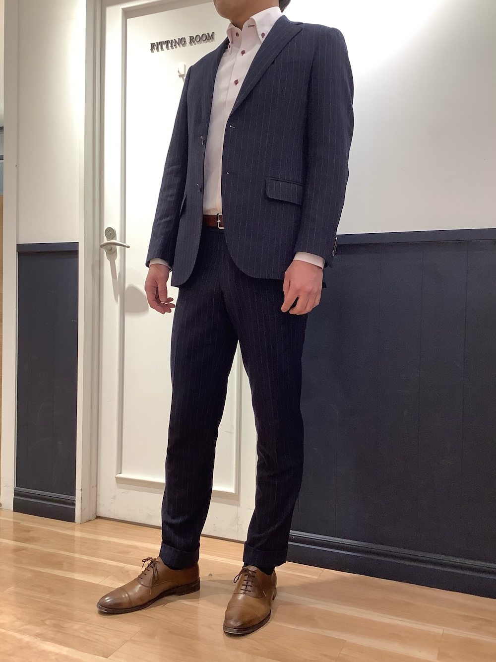 ネイビースーツにピンクシャツのシンプルコーディネート。 ボタンと色糸が深みのある赤色で ノータイでもコーディネートが決まります✨ 綿100%で着心地good!