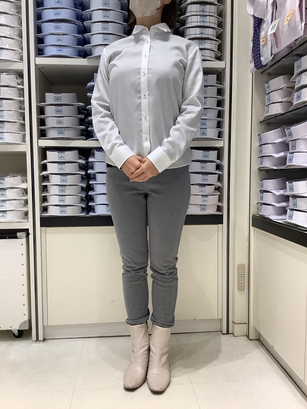 シンプルな白シャツにシンプルなパンツとブーツを合わせてみました☺︎ シャツは地模様にドットが入っていて別生地もドットでさりげなくとてもかわいいです♪