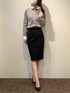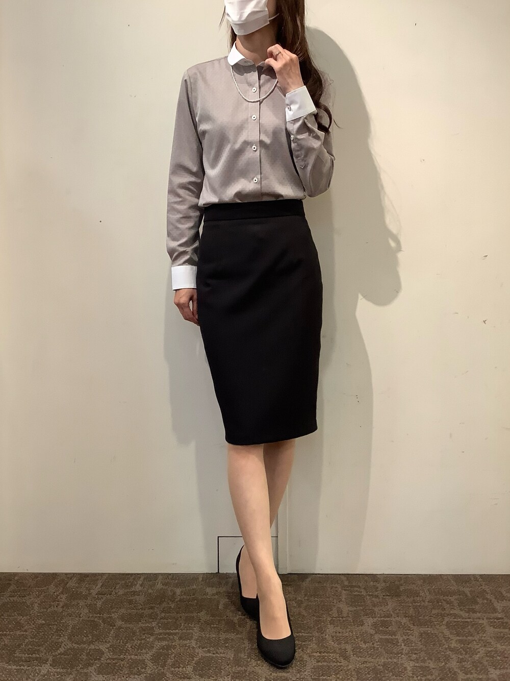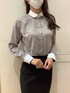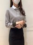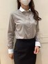 丸襟クレリックがアクセント♪ 一枚でコーディネートが決まるブラウンカラーのシャツです。 タイトスカートと合わせたお仕事コーデにしてみました。 パールのアクセサリーを付けると、女性らしさが出るので、おすすめです♪