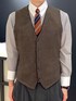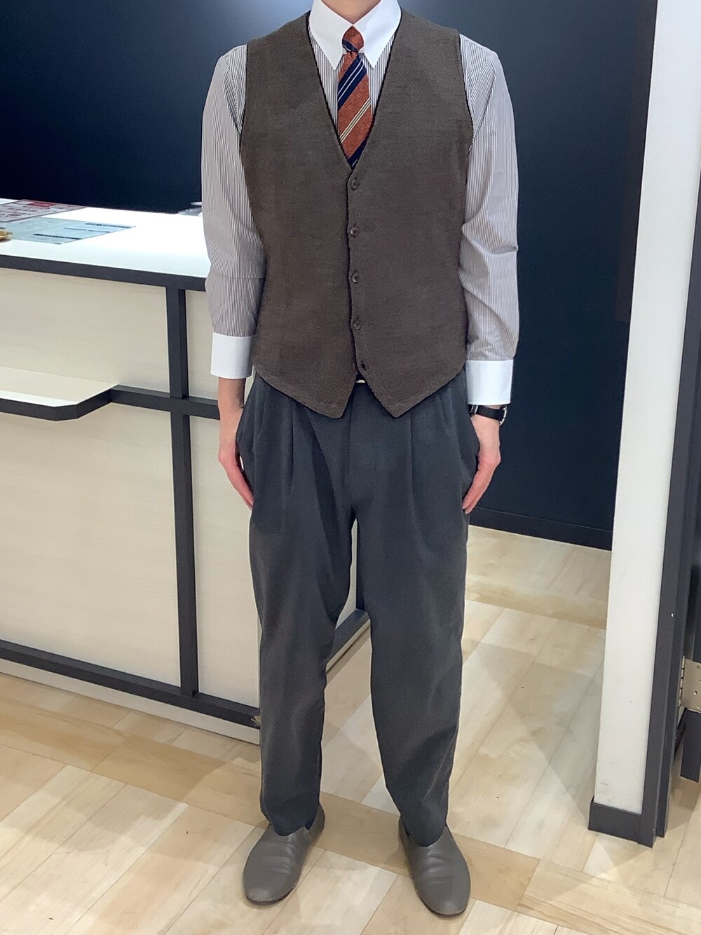 ブラウンストライプのクレリックシャツと同色のニットジレがクラシカルな雰囲気を作ってくれます👌 ネイビースーツなどとも相性◎