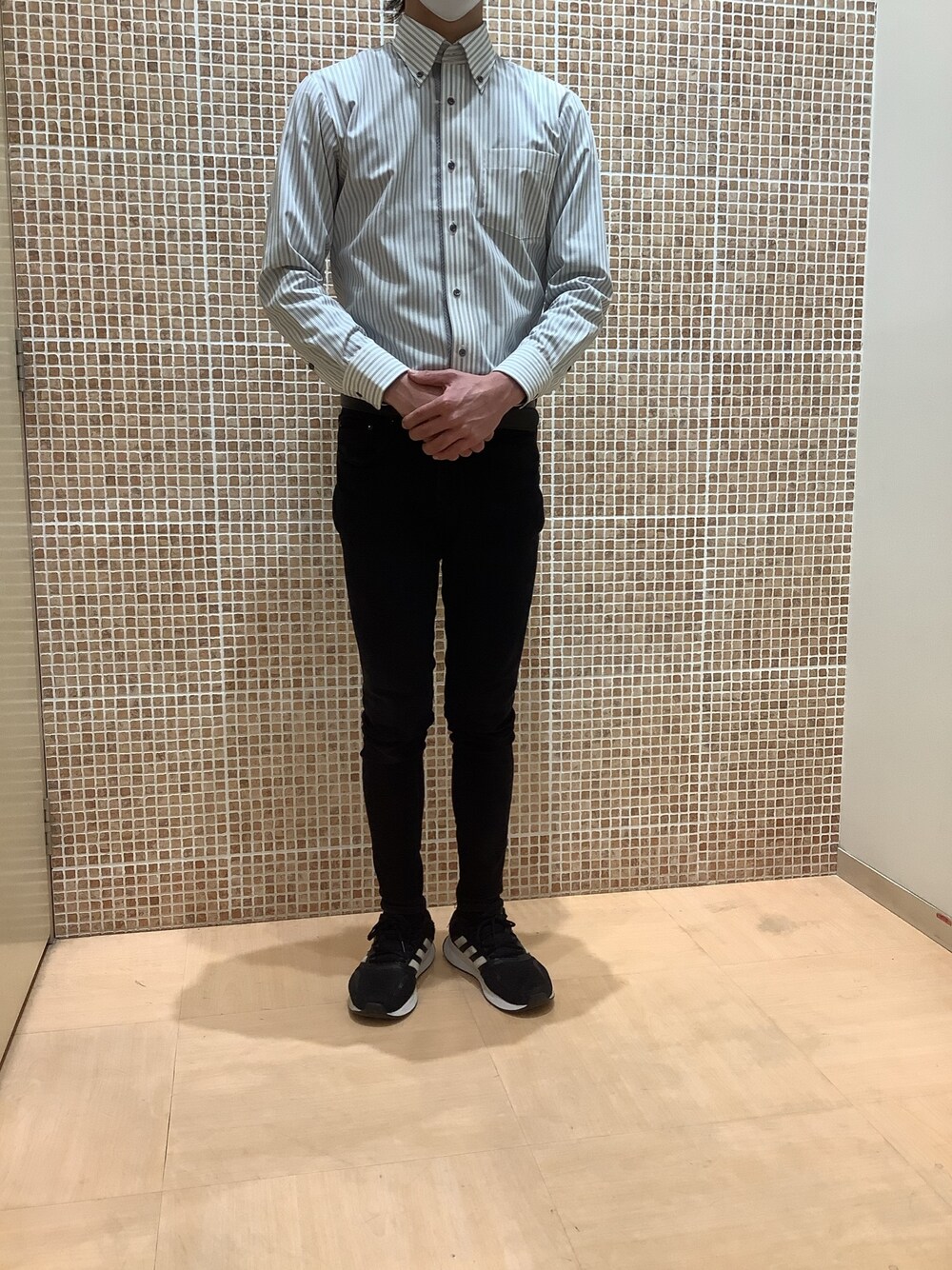 前立てにチェック柄のデザインが施されており、ノーネクタイでもオシャレに見えやすいのでノーネクタイのコーディネートにしてみました。