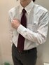 さりげない刺繍がオシャレなシャツ。 ワンポイントの入ったエンジのネクタイとのコーディネートです。
