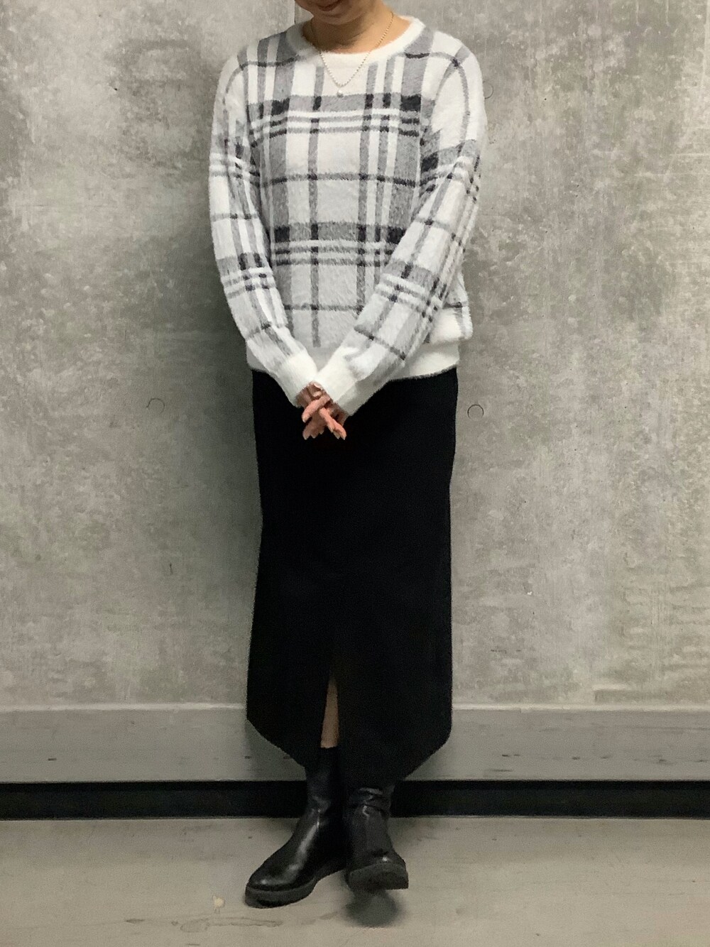 カジュアル顔したニットもモノトーンでまとめると大人かわいいアイテムに早がわり✨ 衿ぐりが浅めなのでお持ちのネックレスをプラスするのがおすすめです☺️ 秋冬の休日コーデにはもちろん、オフィスカジュアルづかいもできます♪ アウターはモノトーンorベージュのコートがおすすめ👌