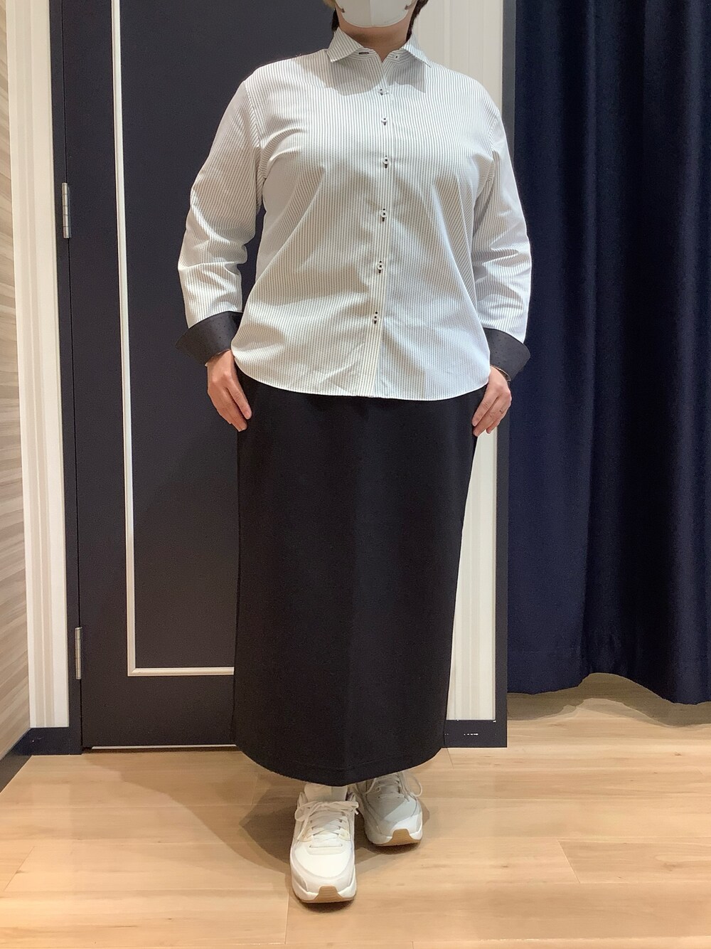 透け防止シャツなので安心して1枚でも着用出来ます◎UVカット機能付きなのも嬉しいポイント🙌 黒のスカートに合わせてモノトーンコーデにしてみました⭐️