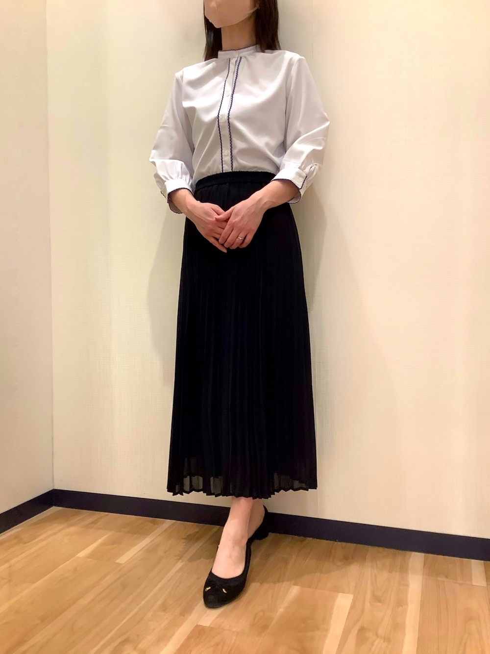 スタンドカラーのブラウスは青いピコレースがアクセントに♪ 黒のボトムスも爽やかに決まります✨