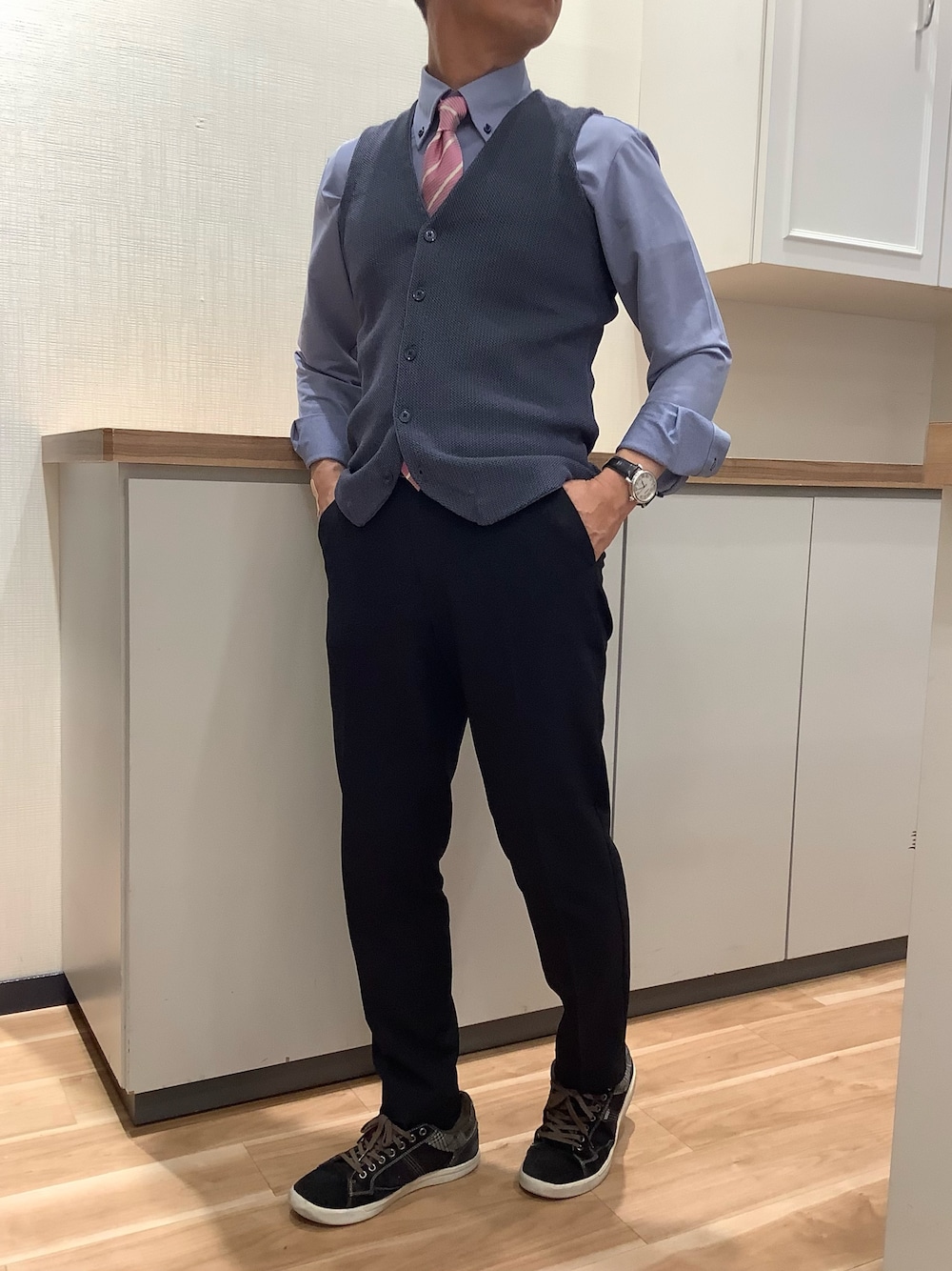 シャツもベストもストレッチ性抜群! 全体的に落ち着いたトーンなので、差し色としてネクタイはピンクにしました。 ニットシャツは、ベタつかない肌触りも特徴なので夏場にもおすすめです。