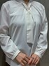 光沢感が綺麗なシルキーサテンブラウスです。ボウタイ部分のメタルパーツがポイント。お手入れもしやすい素材です。