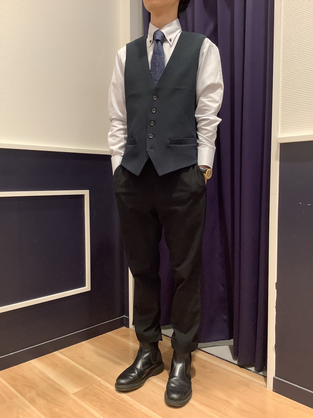 綿100%のシャツは光沢感もありやわらかな生地で着心地が良いです♪ すっきりとしたシルエットのジレと合わせてシックな雰囲気に。 ネクタイはペイズリー柄で大人っぽく。