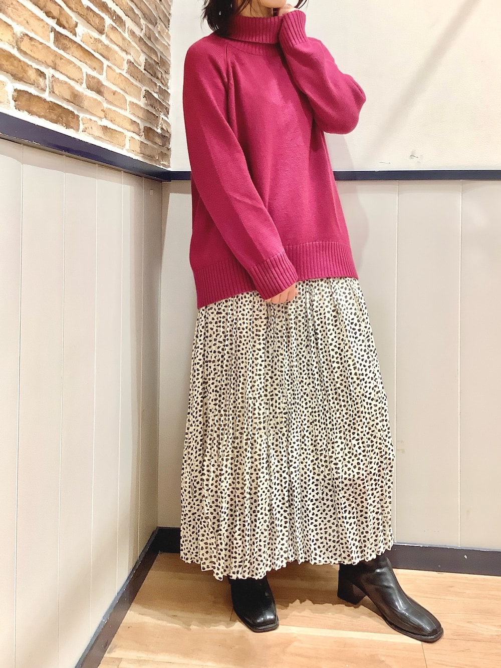 ピンクが主役の大人フェミニンコーデ。ハッキリとした色合いのニットには、デザインのあるプリーツスカートを合わせて甘辛を足し算。足元は大人っぽくエナメルブーツをon。秋冬定番のくすみカラーで大人かわいいスタイルに!