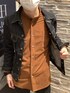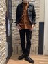 季節感ありのブラウンコーデュロイシャツ。スタンドカラーでカジュアルスタイルに最適。