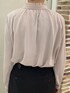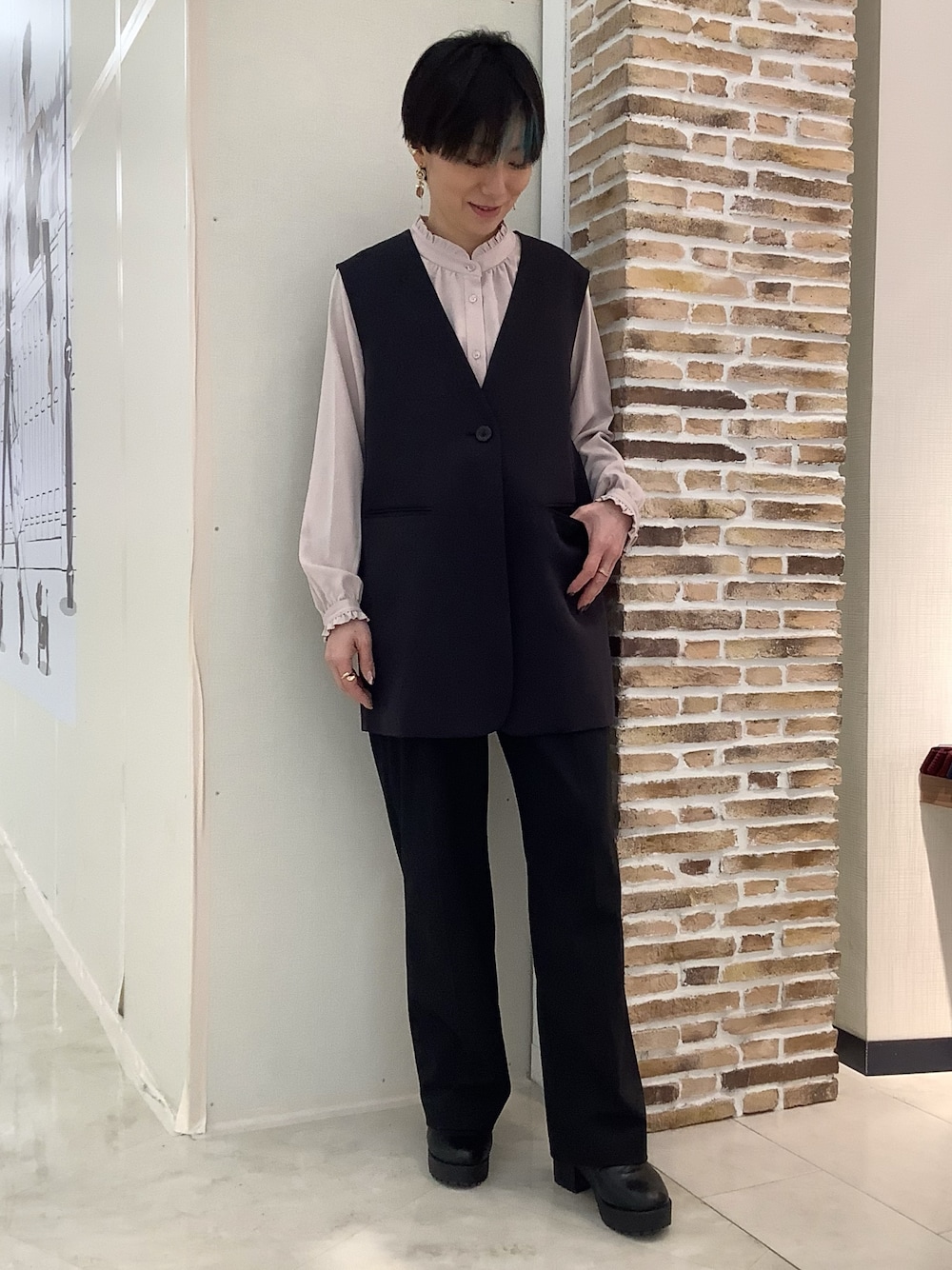 ピンクベージュのフリルブラウスにロングジレを合わせて甘すぎないコーデにしました! ゆったりとしたサイズ感でサラリとした着心地です。 袖口にもフリルが付いているのでジャケットやカーディガンの袖口からチラ見えしてもかわいいです♪