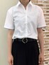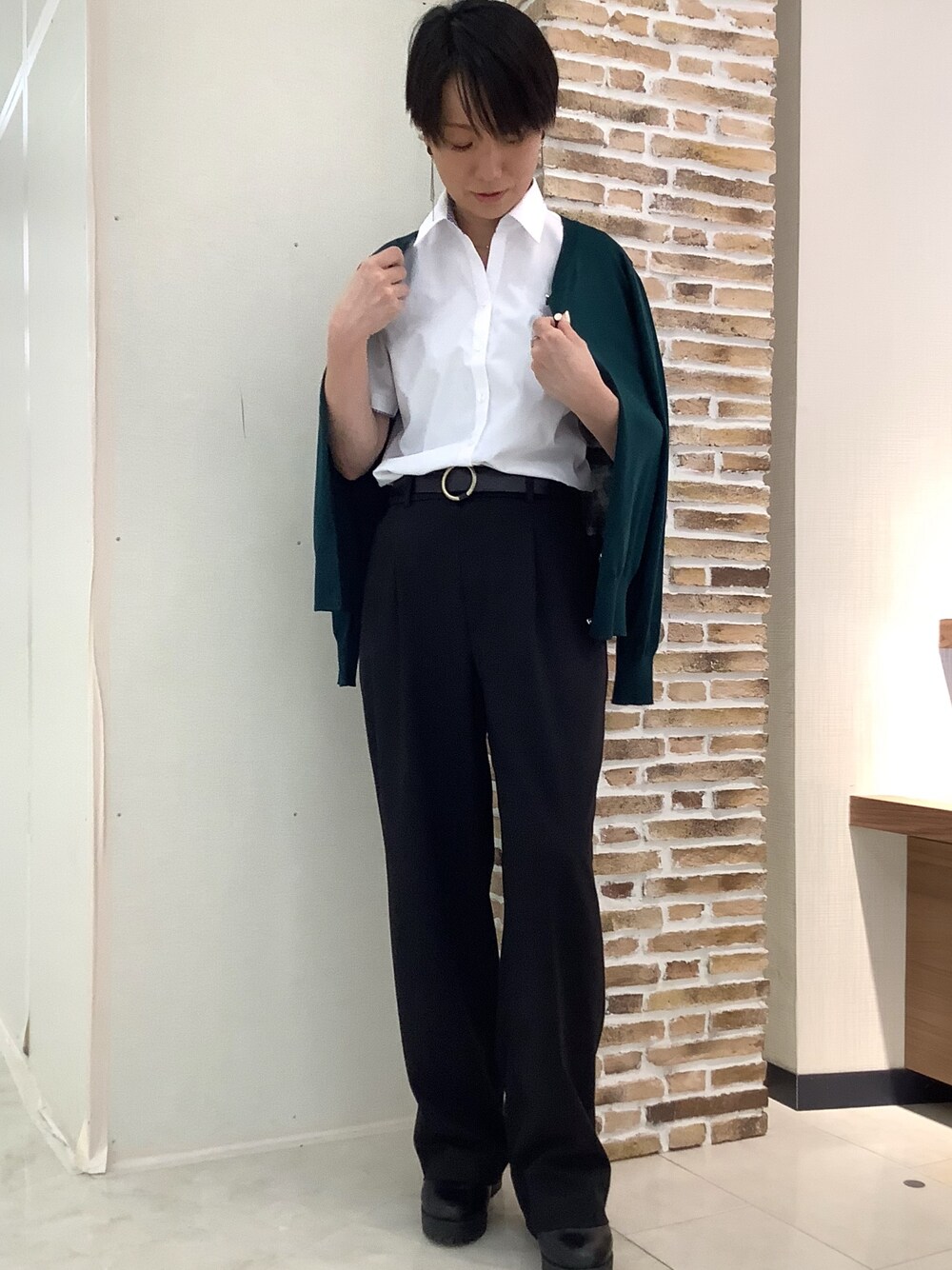 袖口のワンポイントのラインが素敵な白の半袖シャツ♪ グリーンの薄手のカーディガンはゴールドのボタンでとても可愛いです⭐︎ エアコンなどで肌寒い時は羽織りに1枚あるととても重宝します!