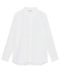 白シャツほどカッチリしすぎない、なめらかな素材でゆとりのある白ブラウスです。 ジャケットにデニムを合わせてカジュアルダウンしたコーディネート。 ブラウスはとろみがあり肌当たりが柔らかです。