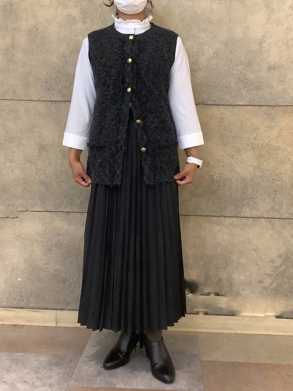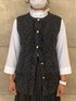 スタンドカラーにフリルがついた、軽くて肌触りが良い素材の七分袖ブラウス♪ 春のオケージョンにいかがですか? ラメの糸が入ったゴージャスな金ボタンのベストを合わせてみました😍