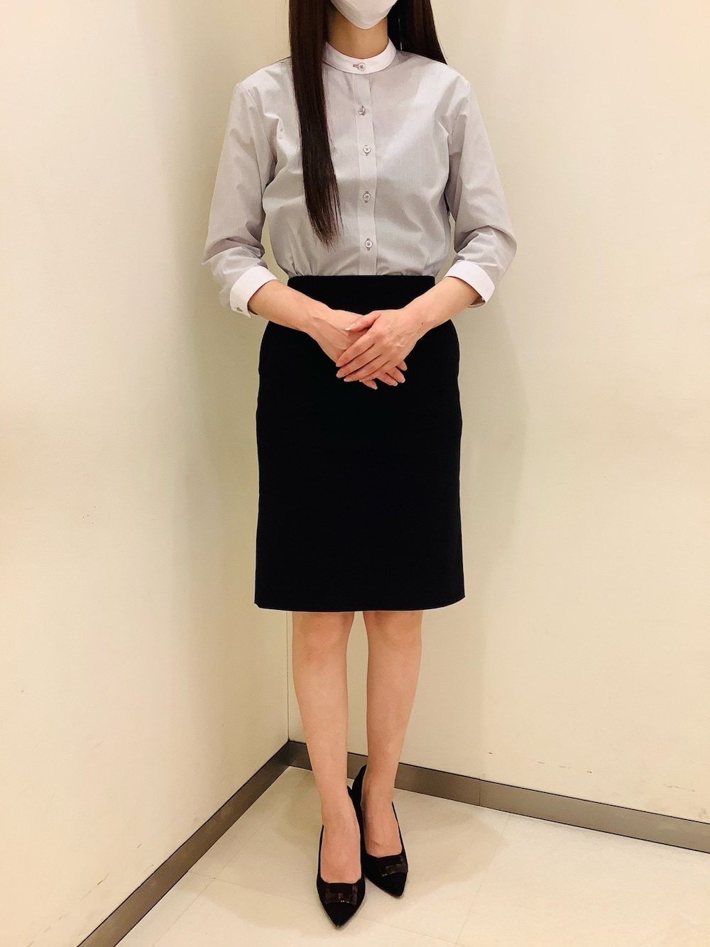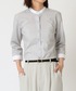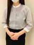 裾デザイン七分袖シャツ グレーストライプ生地にクレリックが上品な印象に…♪ ボトムスはブラックでワントーンコーデもおすすめです。