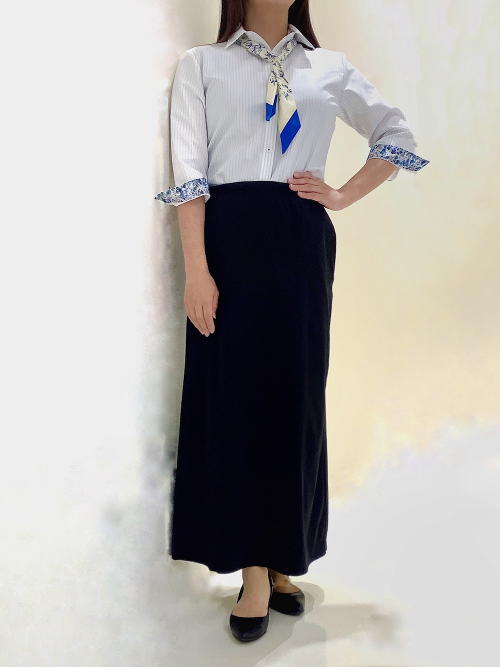 シャツの裾を出した時に印象チェンジ! 白地×ブルーグリーン系のストライプ柄がポイント! 爽やかなブルーの小花柄がかわいい! ハリ感のある素材できちんと感を与えます。 カフスは折り返すと襟裏の別生地と同じ生地が覗きポイントに♪ 折り返さなければシンプルに、デザインの二刀流!