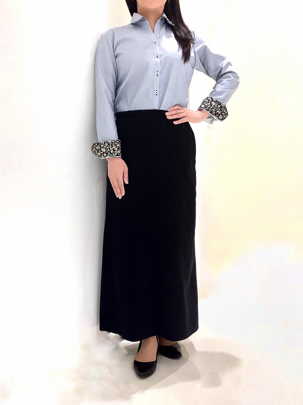 晩夏から初秋らしいクラシカルな印象のスモーキーなグリーン生地。 主張控えめなストライプ柄のシャツ。 ベーシックカラーのボトムスとの相性も抜群! アンティークな花柄の別生地のイエローが差し色に。 カフスを折り返して表情を変えるのがおすすめ。 季節の変わり目を楽しめる1枚になること間違い無し♪